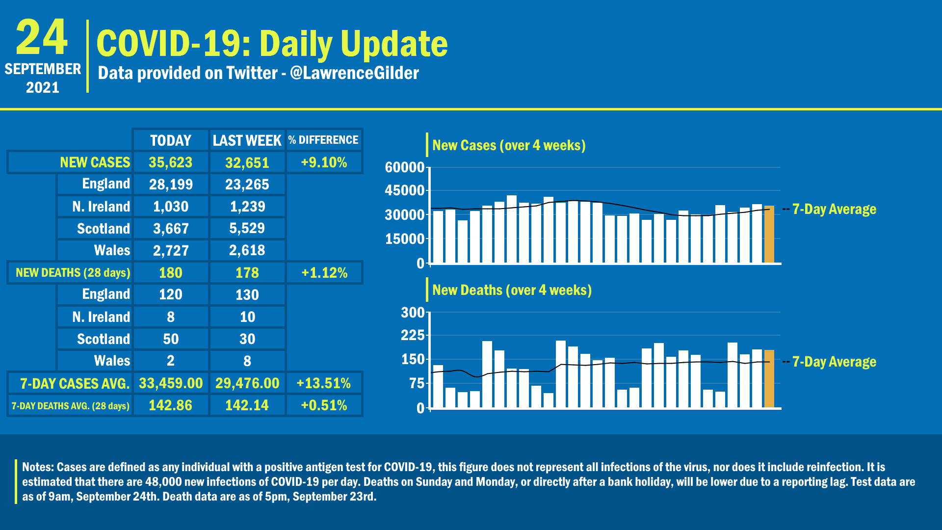 UK #DailyCovidUpdate | 24th September 2021 - Cases: 7,601,487 (+35,623) - Average Cases: 33,459.00 - Deaths (28-day): 135,983 (+180) - Deaths (60-day): 155,384 (+209) - Average Deaths: 142.86 - Vaccine [1st dose]: 48,705,771 (+31,617) - Vaccine [2nd dose]: 44,644,887 (+44,817)