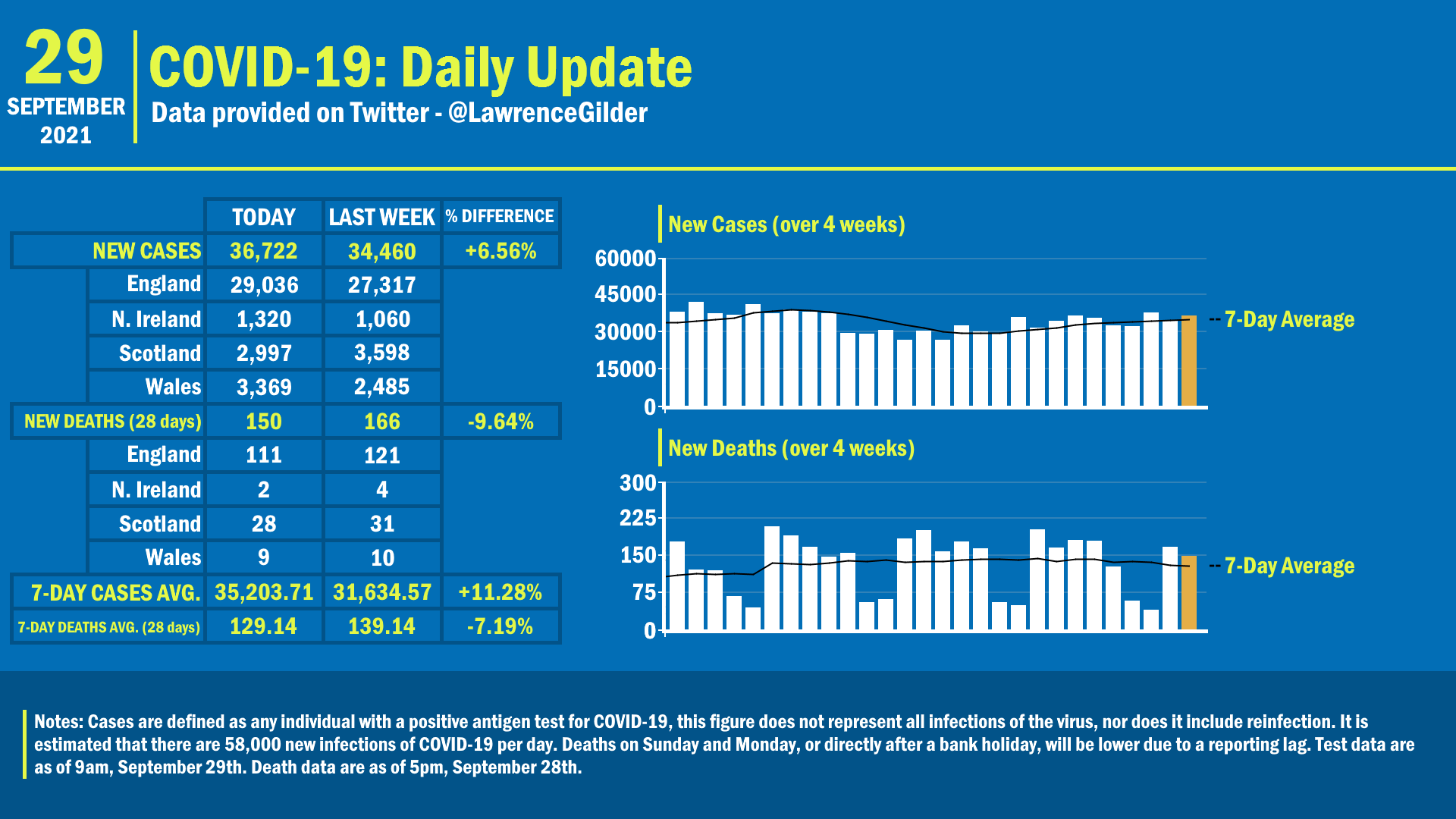UK #DailyCovidUpdate | 29th September 2021 - Cases: 7,771,294 (+36,722) - Average Cases: 35,203.71 - Deaths (28-day): 136,525 (+150) - Deaths (60-day): 156,037 (+176) - Average Deaths: 129.14 - Vaccine [1st dose]: 48,797,579 (+31,853) - Vaccine [2nd dose]: 44,833,280 (+33,532)