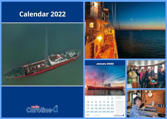 The Radio Caroline 2022 calendar now on sale - colourful images of Ross Revenge, crew & visitors. This attractive A4 calendar is sure to brighten up your wall, £10 each/2 for £17 + postage (ltd offer). Buy in the web shop at radiocaroline.co.uk or on board Ross Revenge